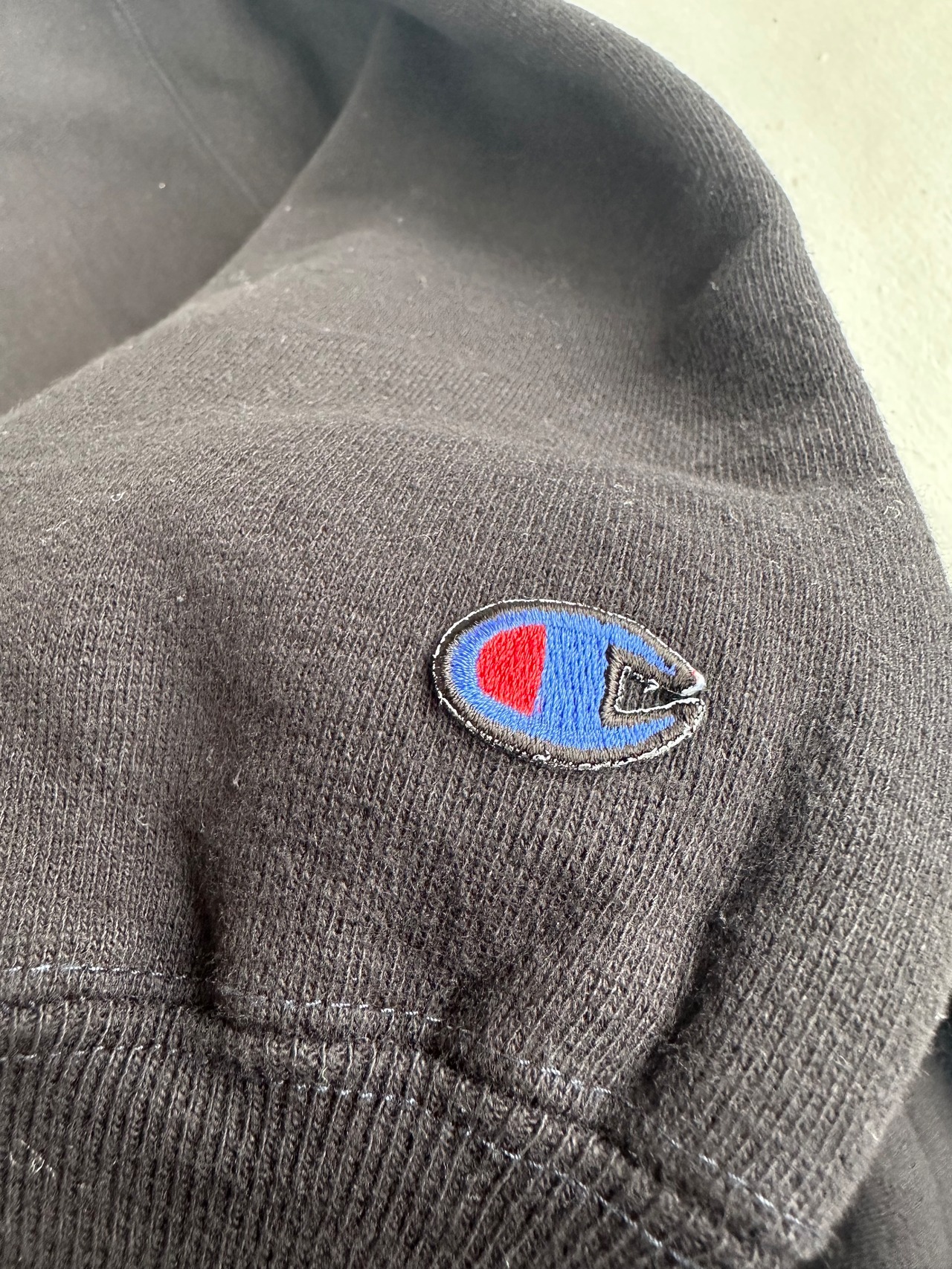 狙い通り、ポリのステッチだけネイビー色が残る特有の表情、ブラックボディにネイビーステッチ◎リバースウィーブ好きにはたまらない配色かと!