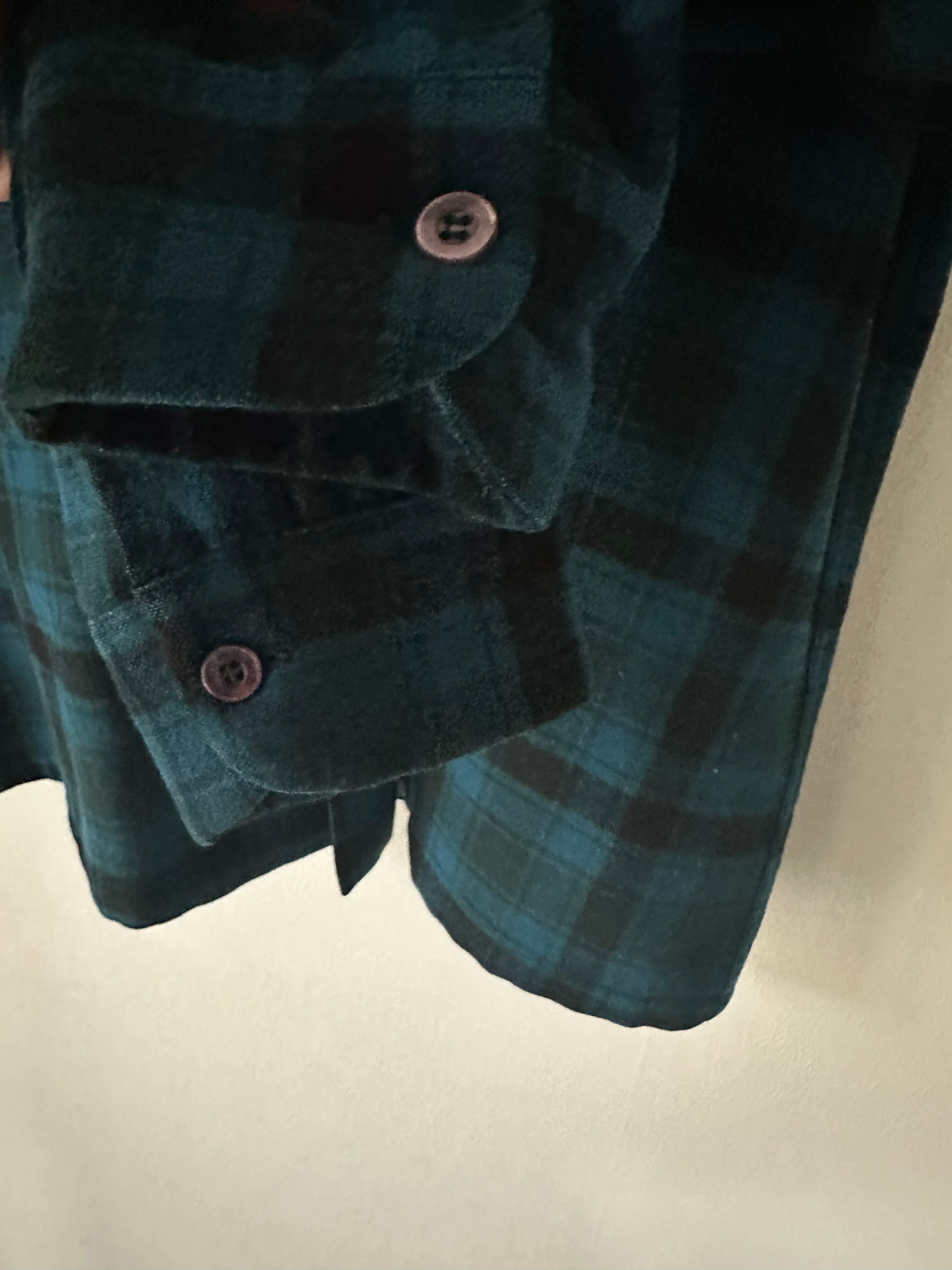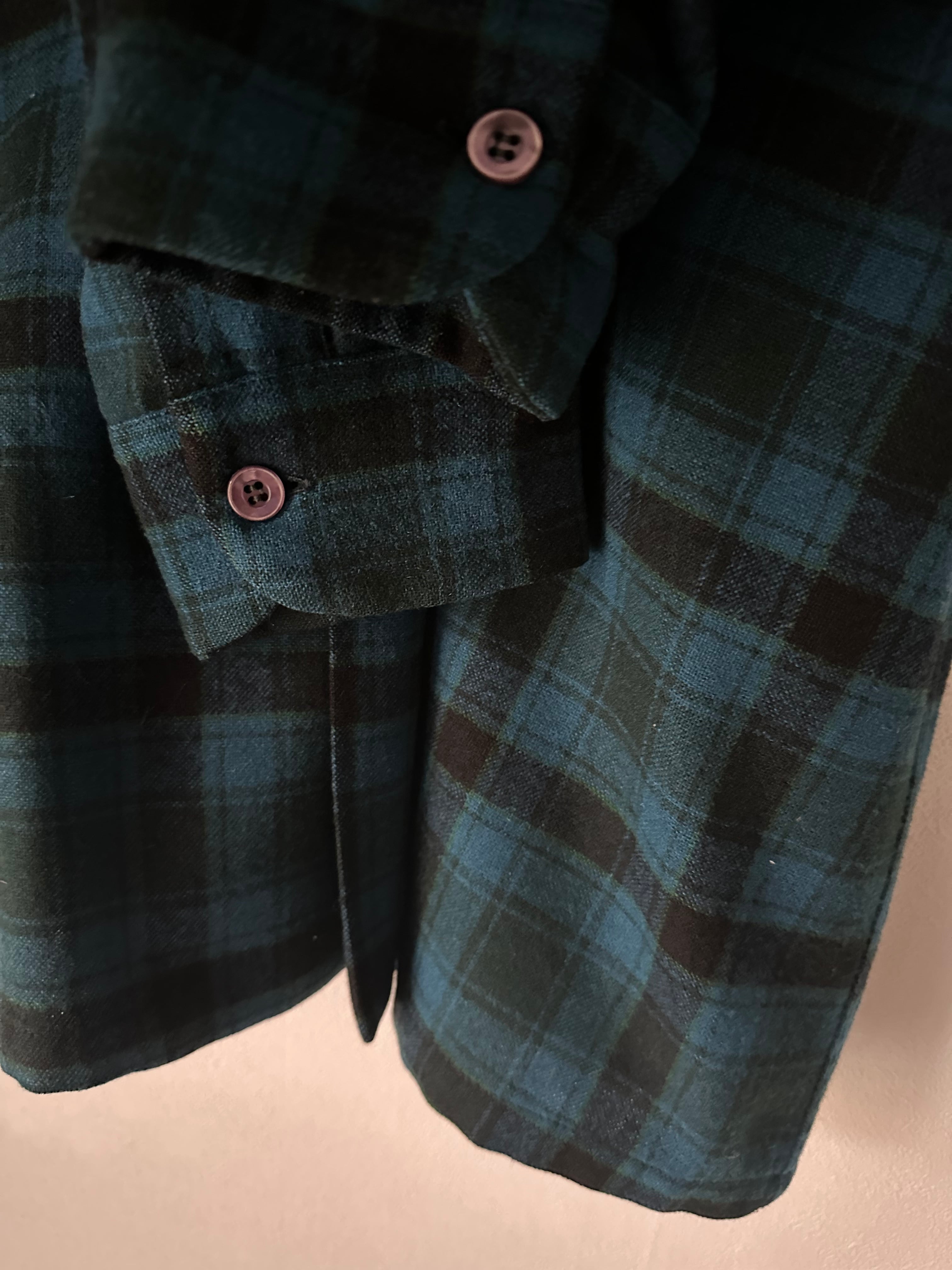 ブルーベースでブラック、グリーンのチェックシャツ