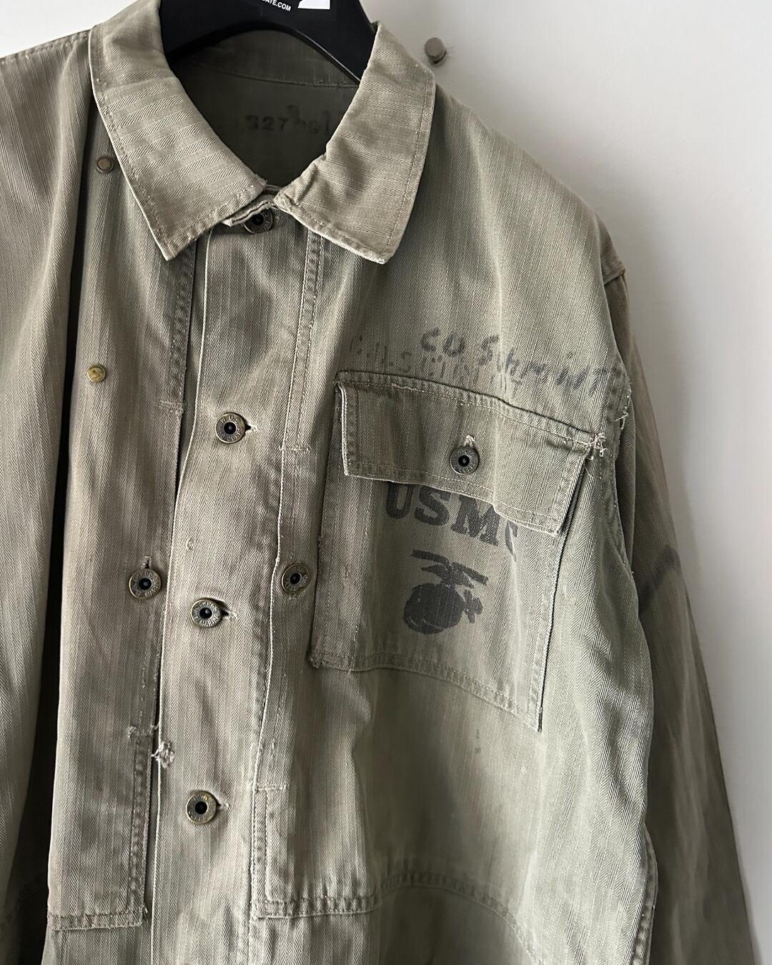 フェードした生地感、汚れやラクガキの入り方です!このくらい着られてる方が良いかと!
